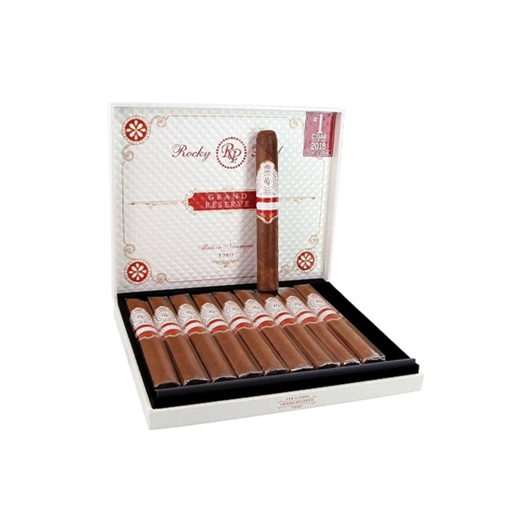 Voted Cigar of the Year in 2018 by Cigar Journal. The Rocky Patel Grand Reserve cigar is crafted with a unique blend designed specifically for the global market. While the exact tobaccos remain a secret, the cigars are known to be expertly rolled in Nicaragua. This super creamy cigar delights the palate with a subtle sweetness reminiscent of dried fruit and chocolate, accompanied by delicate bitter notes of tea. It also features complex aromas of wood, leather, and nuts.